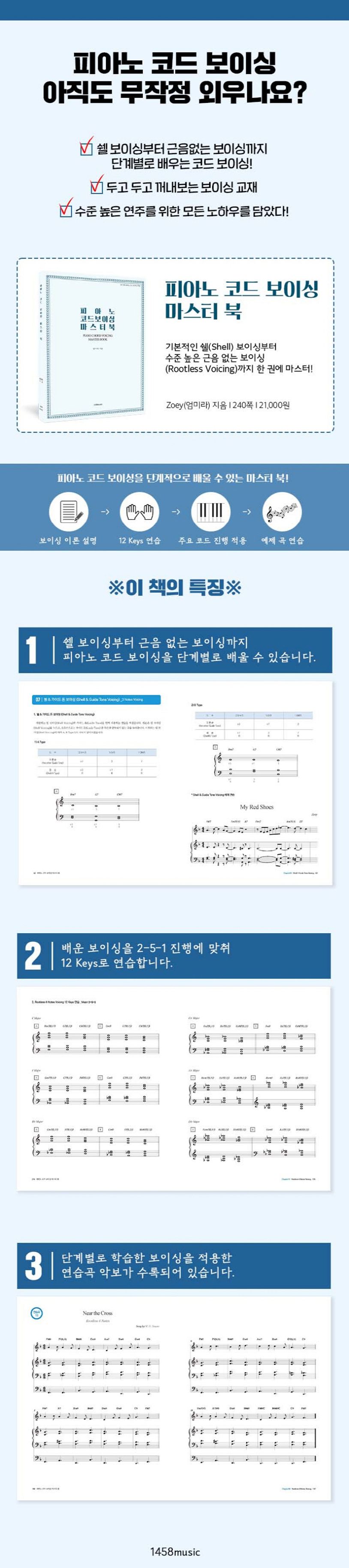 ‘피아노 코드 보이싱 마스터 북’은 피아노 코드 보이싱(Voicing)을 체계적으로 정리한 교재입니다. 가장 기본적인 쉘(Shell) 보이싱과 가이드 톤(Guide Tone)의 개념부터 시작해, 4 Notes Voicing, 5 Notes Voicing을 거쳐 고급 이론인 근음 없는 보이싱(Rootless Voicing)까지 설명하고 있습니다.