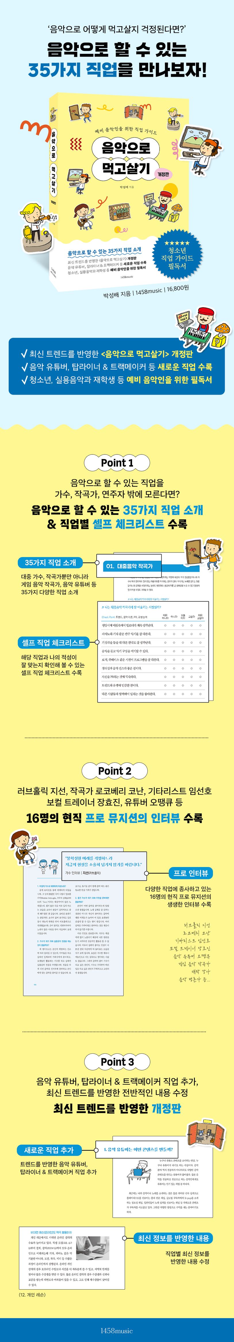 〈음악으로 먹고살기(개정판)〉를 통해 음악을 사랑하는 학생들이 직업에 대한 안목을 키우고, 자신의 꿈을 찾아가는 여정에 한 걸음 나아가길 소망해 본다.