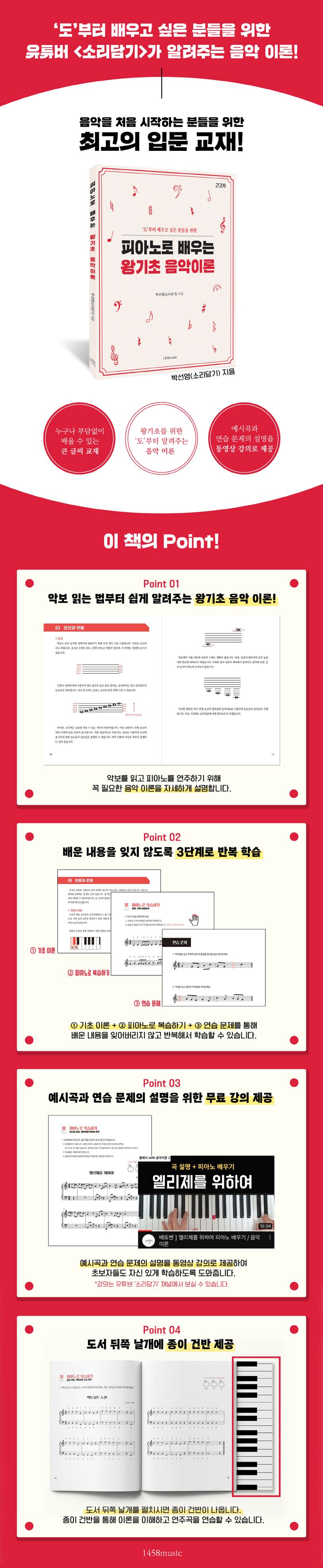 ①기초 이론 + ②피아노로 복습하기 + ③연습문제를 통해 배운 내용을 잊어버리지 않고 반복해서 확인할 수 있도록 구성하였습니다. 특히 저자가 운영하는 유튜브 소리담기 채널을 통해 예시곡과 연습문제의 설명을 동영상 강의로 제공하여 초보자들도 자신 있게 학습하도록 도와줍니다.