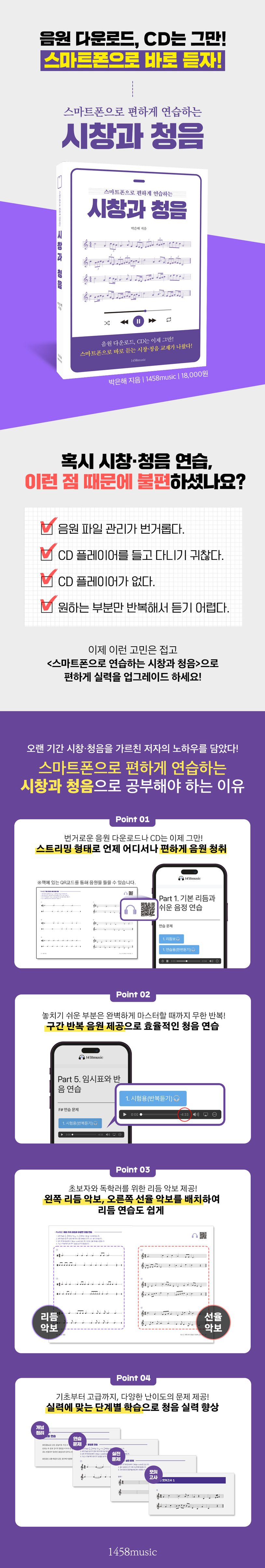 〈스마트폰으로 편하게 연습하는 시창과 청음〉은 음원을 다운로드하거나 심지어 CD로 제공했던 기존의 시창·청음 교재와 달리 음원 스트리밍 사이트에서 음악을 듣는 것처럼 편하게 음원을 청취할 수 있는 교재이다.