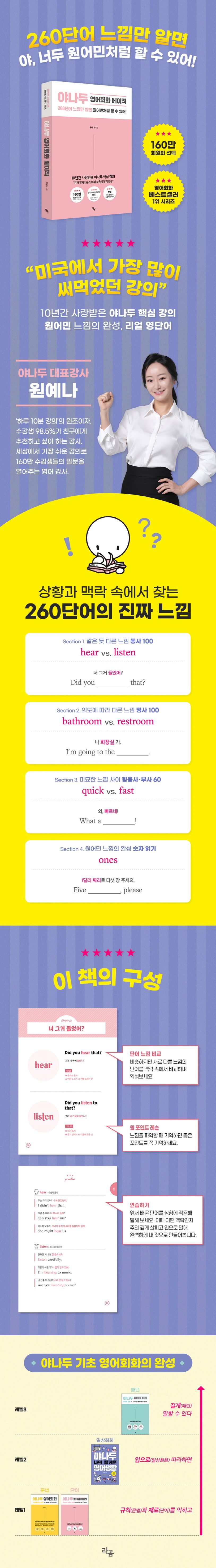 이 책의 핵심은 see와 look, bathroom과 restroom, quick과 fast 등 낯익은 단어들이지만 막상 영어로 말하면 헷갈리는 단어를 상황과 맥락 속에서 느낌을 잡는 것이다. 또한 날짜, 시간, 분수, 소수점 등 어디서도 알려주지 않는 숫자 읽기를 통해 원어민 느낌을 완성한다.