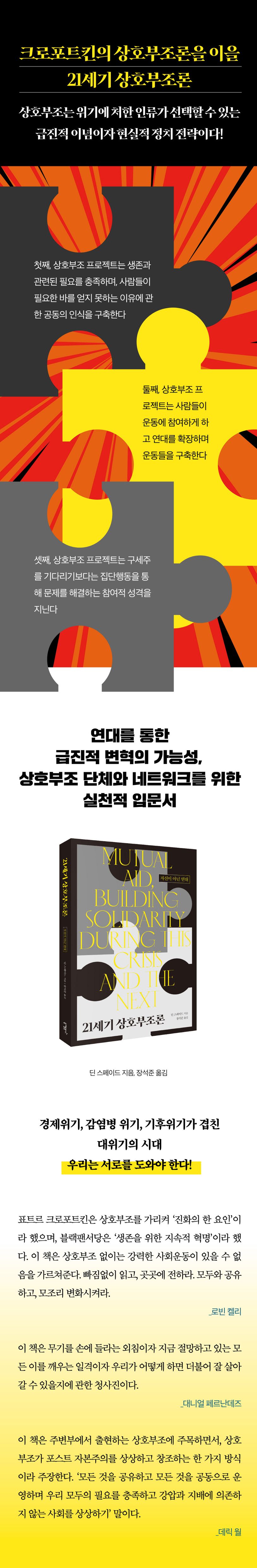 “표트르크로포트킨은상호부조를가리켜‘진화의한요인’이라했으며,블랙팬서당은‘생존을위한지속적혁명’이라했다.딘스페이드는상호부조가지속적혁명과연대를이루기위한근본토대임을강조한다.우리시대의필수안내서인이책은상호부조없이는강력한사회운동이있을수없음을가르쳐준다.빠짐없이읽고,곳곳에전하라.모두와공유하고,모조리변화시켜라.”-로빈켈리