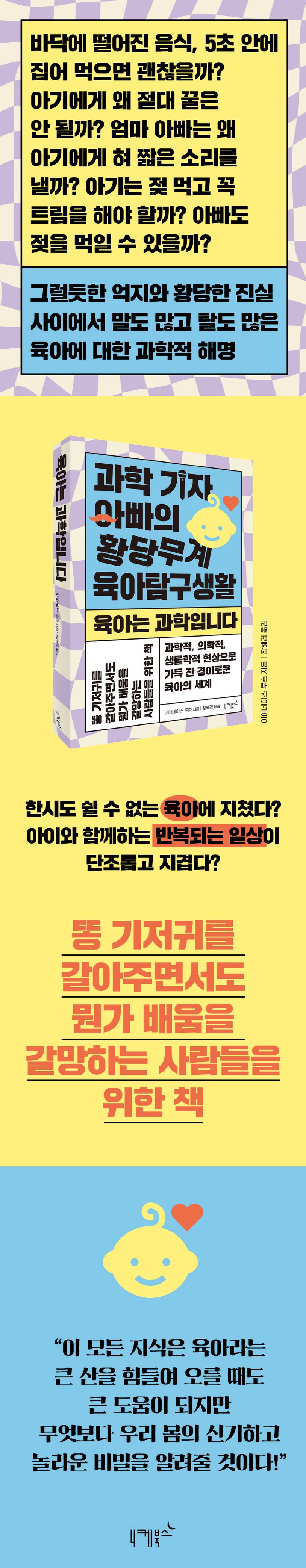 이 책은 ‘바닥에 떨어진 음식이라도 5초 안에 집어 먹으면 된다’는 주장에 근거가 있는지, ‘어린아이에게 꿀과 견과류를 먹이지 말라’는 진짜 이유는 무엇인지 하는 일상적인 궁금증에서 ‘이가 나는 시기에는 엉덩이가 붉어진다’는 황당한 가설과 ‘아빠도 젖이 나오게 할 수 있을까’ 하는 기상천외한 의문까지 14가지 주제를 다룬다. 과학적 데이터를 다루면서도 특유의 쉽고 유머러스한 문체와 재치 있는 일러스트를 활용하며 실제로 경험한 에피소드와 흥미로운 곁가지 정보를 엮어 펼쳐나가는 덕분에, 이 책을 읽다 보면 임신 출산과 관련된 지식이나 분만과 탄생 초기의 비밀, 아기의 신체가 발달해가는 과정이나 단계별 특징 등 다양한 정보를 자연스럽게 체득하게 된다. 웃음을 지으며 흥미진진하게 읽는 사이 저절로 풍부한 과학 상식과 육아 정보를 얻게 되는 마성의 책이다.