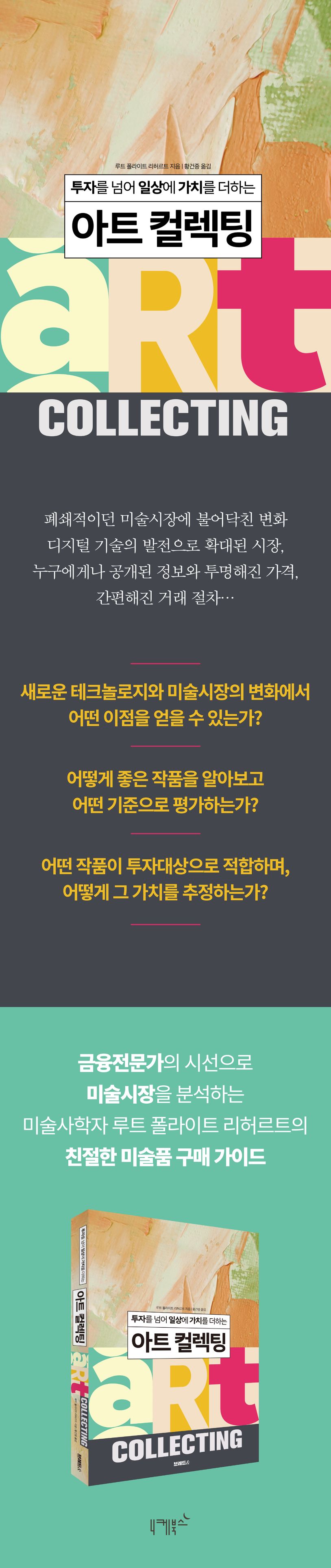 이 책은 먼저 미술시장에 대한 선입견을 둘러본 후 미술시장에 작용하는 법칙을 이해하기 쉽게 설명하고, 미술사와 미술품의 종류 등에 대한 기본적인 정보를 개괄한다. 미술시장에서 가격이 어떻게 형성되는지, 작품의 품질을 어떻게 판단하는지 등 독자들이 가장 궁금해할 부분을 알려줄 뿐 아니라, 저자가 직접 고안한 기법에 따라 미술품 구매 7단계를 정리해 현명한 투자를 위한 의사결정 기준을 제시한다. 개인적인 경험담과 미술계 동향을 파악할 수 있는 뉴스, 미술시장 최전선에 있는 사람들과의 인터뷰, 독자들이 스스로 점검할 수 있는 체크리스트 등 다양한 형식의 글이 미술시장을 다각도에서 볼 수 있게 하며 아트 컬렉팅 입문을 도와준다. 특히 2023년 최신 개정판을 번역한 이 책에서는 NFT와 인공지능 등 지금 미술계에서 가장 핫한 이슈를 짚고 있다.
