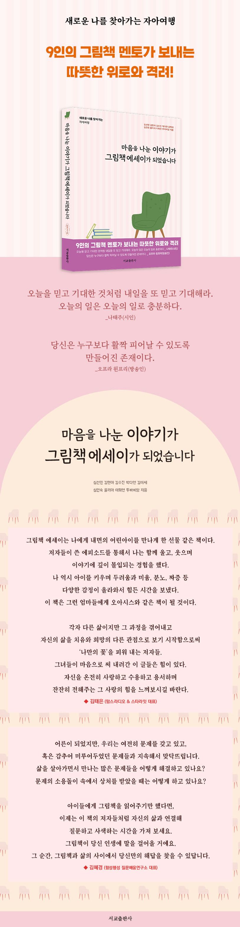 6개의 주제에 걸쳐 소개된 51권의 그림책은 저자들의 여정을 따라가는 즐거움을 선사하는 동시에 그림책에 관심만 가져왔던 독자들에게 어떤 그림책을 읽을지에 대한 훌륭한 정보를 제공해줄 것이다. 각 장의 마지막 부분에 마련된 ‘마음을 나누는 글쓰기 교실’은 독자들에게 직접 질문을 던지며 마음을 살펴볼 수 있게 한다. 때로는 혼자서, 때로는 마음을 나눌 수 있는 사람들과 함께 자신의 감정을 가만히 들여다보는 시간을 가져보면 어떨까? 그 순간, 그림책이 당신의 인생에 말을 걸어오는 놀라운 일이 발생할 것이다.