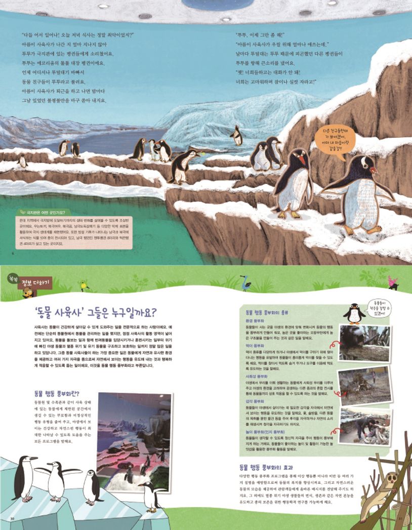 * [한밤중 동물 친구들에게 생긴 일]은 극지관에 사는 젠투펭귄 투투가 사육사들에 대한 불만을 털어놓으려 한밤 중에 생태원의 다른 동물들을 찾아다니지만, 오히려 다른 동물들을 통해 사육사들에 대한 고마움을 알게 된다는 내용의 동화입니다.