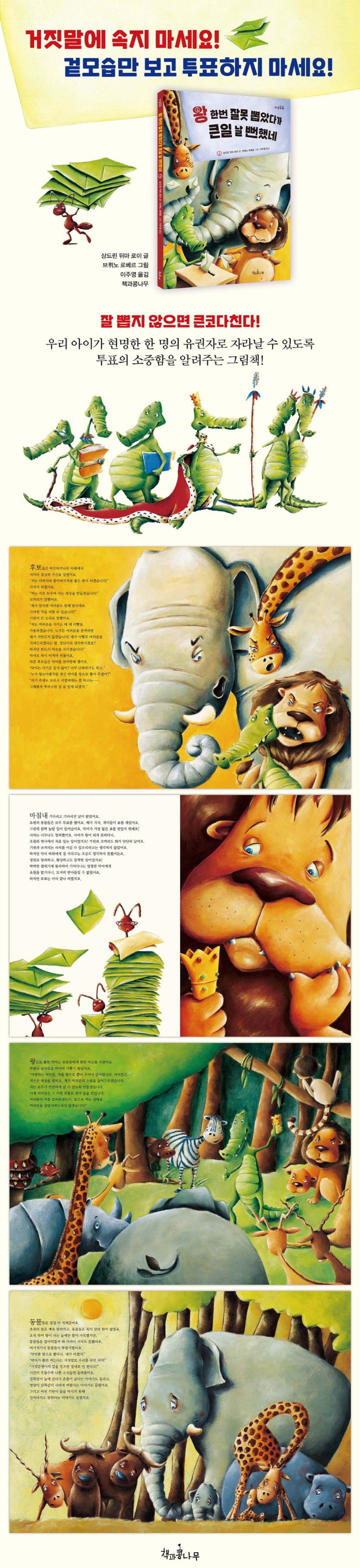 사자, 코끼리, 기린, 악어가 초원의 왕이 되려고 나섰어요. 후보들은 열심히 자신을 알렸고, 동물들에게 여러 가지 약속을 했어요. 드디어 초원의 투표 날, 동물들은 모두 투표를 했지요. 저녁이 되자, 개미들이 표를 세어 보았더니, 놀랍게도 악어가 초원의 왕으로 뽑혔지 뭐예요. 처음에는 모든 것이 만족스러웠어요. 하지만 초원에 비가 내리지 앉자, 모든 게 바뀌었지요. 더구나 악어가 한 약속이 모두 거짓말이라는 것이 드러났어요.