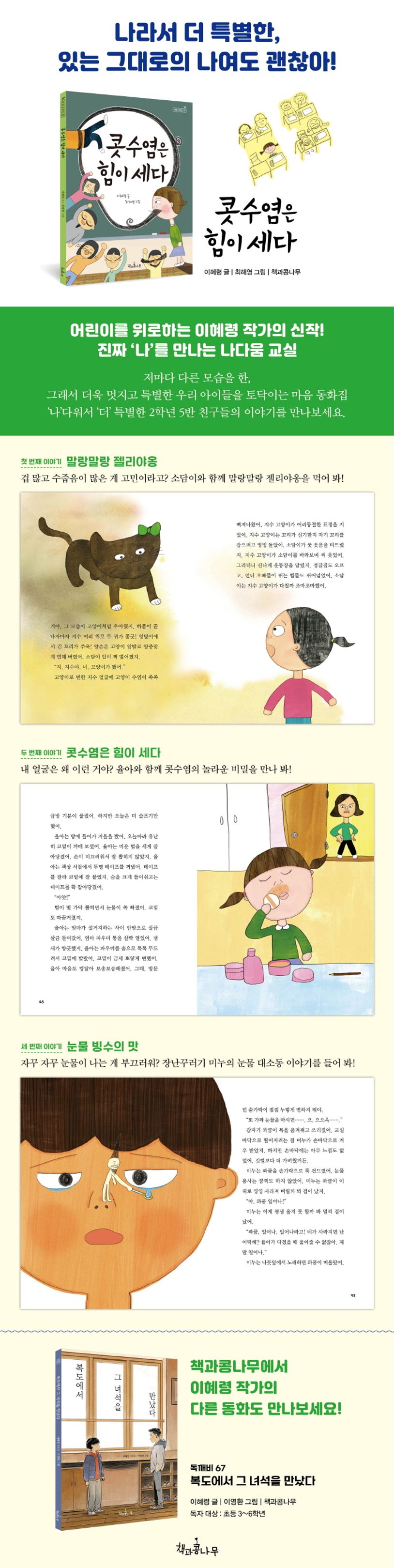 책콩 저학년 9권. 이혜령 작가의 신작. 저마다 다른 모습을 한, 그래서 더욱 멋지고 특별한 우리 아이들을 토닥이는 마음 동화집이다. 누구나 한 번쯤 겪어봤을 고민을 통해 진정한 ‘나’를 배워가는 2학년 5반 어린이 세 명의 이야기를 묶었다. 독자들이 ‘나다움’이란 무엇인지 자연스레 고민해볼 수 있을 것이며, 나아가 스스로 용기를 불어넣을 수 있을 것이다.