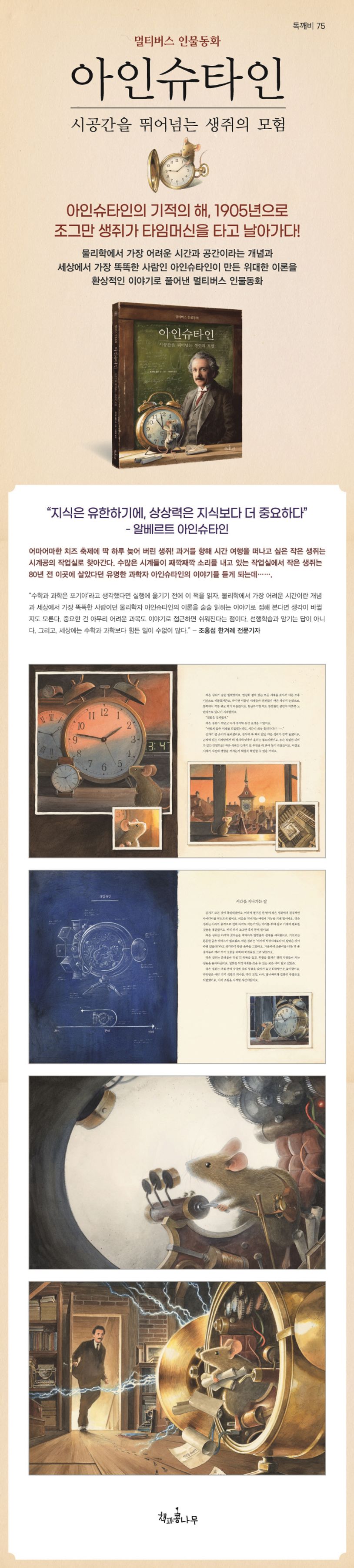 독깨비 75권인 『아인슈타인 시공간을 뛰어넘는 생쥐의 모험』은 어마어마한 치즈 축제에 딱 하루 늦어 버린 조그만 생쥐가 아인슈타인의 가장 위대한 해였던 1905년으로 시간을 거슬러 돌아가며 벌어지는 모험 이야기다. 이 대담한 모험 이야기는 자그만 생쥐가 달력을 한 장 한 장 넘기며 시작된다.