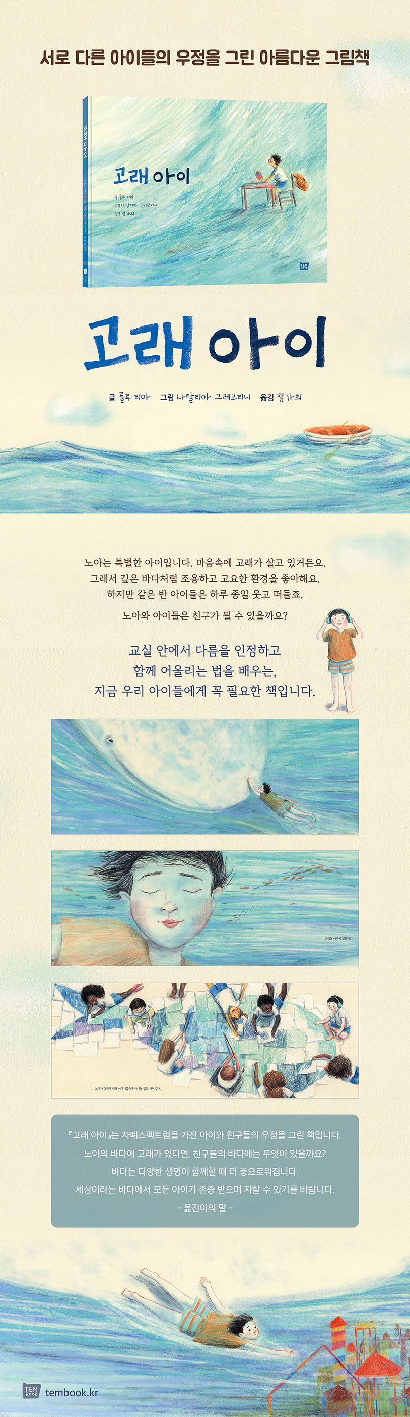 서로 다른 아이들의 우정을 그린 아름다운 그림책입니다. 작가는 자폐스펙트럼 아동을 향한 섬세한 이해와 따뜻한 시선을 안고 그 세계로 들어가 그 안에 담긴 아름다움과 숨겨진 힘을 발견합니다. 그리고 자폐아동과 친구들이 서로를 이해하고 받아들이는 모습을 옆에서 조용히 함께하듯 그려 냅니다. 이 민감하면서도 도전적인 영역은 이제 우리에게 평범하게, 때로는 친근하게 다가와 서로 다른 사람을 포용하고 받아들이는 단순한 이야기가 됩니다.