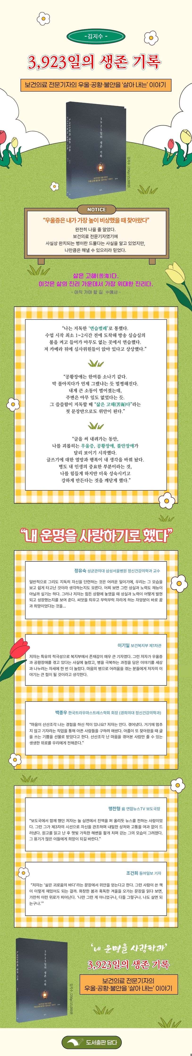 이 책은 보건의료 전문기자이면서 환자이기도 한 저자의 3,923일간 ‘생존 기록’이다. 3,923일은 10년 하고 9개월이다. 저자가 우울증과 공황장애, 불안장애 첫 진단을 받았을 때부터 이 책을 퇴고했을 때까지 기간이다. 우울과 공황, 불안이 뒤흔드는 삶 속에서 감정 조절이 어려워 죽고 싶다는 생각과 싸워 이겨낸 시간으로, 그동안의 모든 과정이 여과 없이 담겨있다.