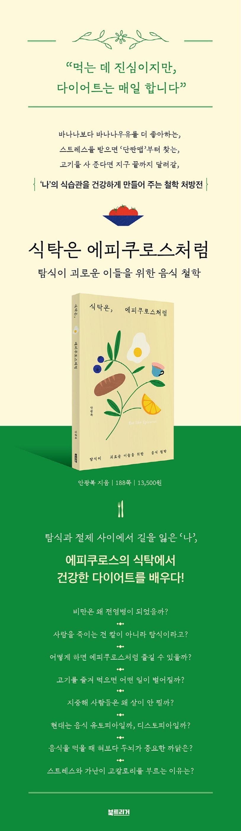 철학자이자 고등학교 철학 교사인 안광복은 먹방과 다이어트의 홍수 속에서 혼란을 겪고 있는 우리에게 이제는 ‘에피쿠로스’를 바라보아야 할 때라고 말한다. “빵과 물만 있다면 신도 부럽지 않다”고 말한 에피쿠로스처럼, ‘가장 단순하고 소박한 먹거리에서도 풍성한 식탁의 기쁨’을 누리는 법을 익혀야 한다는 의미다.