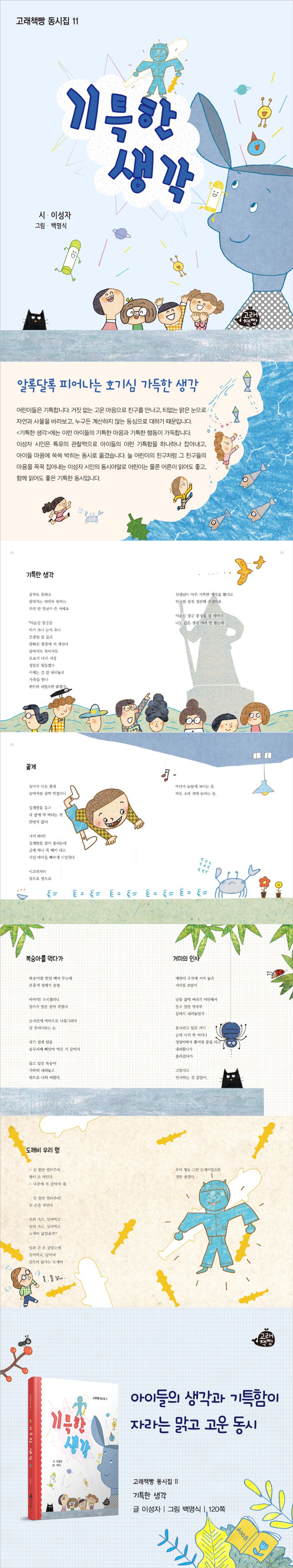 어린이들은 기특합니다. 거짓 없는 고운 마음으로 친구를 만나고, 티없는 맑은 눈으로 자연과 사물을 바라보고, 누구든 계산하지 않는 동심으로 대하기 때문입니다. 〈기특한 생각〉에는 이런 아이들의 기특한 마음과 기특한 행동이 가득합니다. 기특한 아이들은 동시 속에서 이순신 장군을 올려다보며 힘드니 이제 칼 내려놓고 쉬기를 바라고, 꽁꽁 언 동태 눈을 바라보며 언젠가 바다로 돌아갈 희망을 발견합니다.