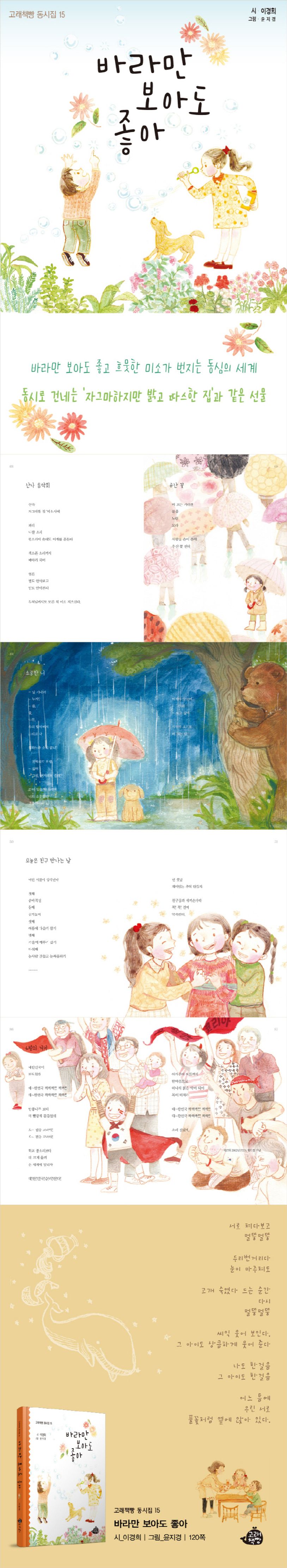 〈바라만 보아도 좋아〉는 이렇게 아이 어른 모두에게 정두리 시인의 해설처럼 ‘자그마하지만 밝고 따스한 집’과 같은 순수한 동심의 세계로 안내합니다.