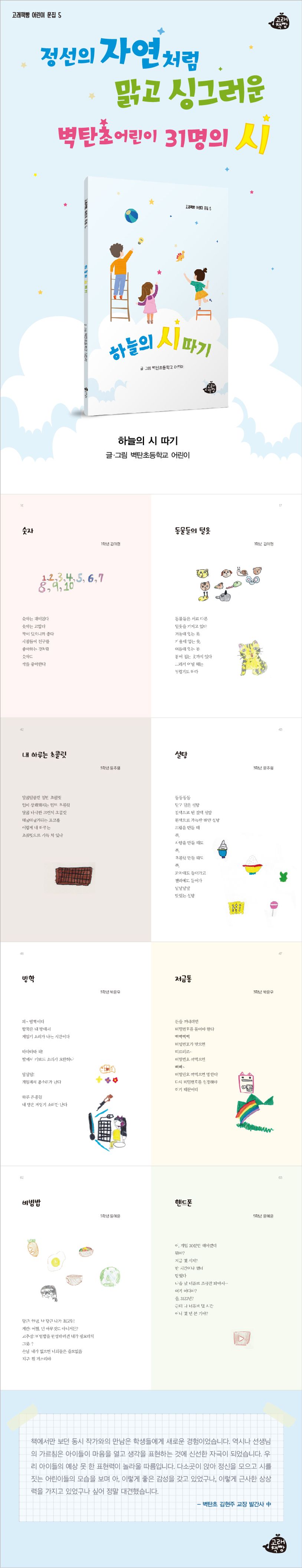 강원도 정선의 가리왕산 자연휴양림으로 가는 길목에 자리한 작고 예쁜 벽탄초등학교 어린이 31명의 시를 모은 고래책빵 어린이 문집 제5권이다. 김남권 시인이 진행한 ‘동시야 놀자’ 수업을 통해 탄생한 어린이들의 시를 책으로 엮어 1학년부터 6학년까지 전 학년이 지은 시 50편을 싣고, 직접 그린 그림을 함께 곁들였다.
