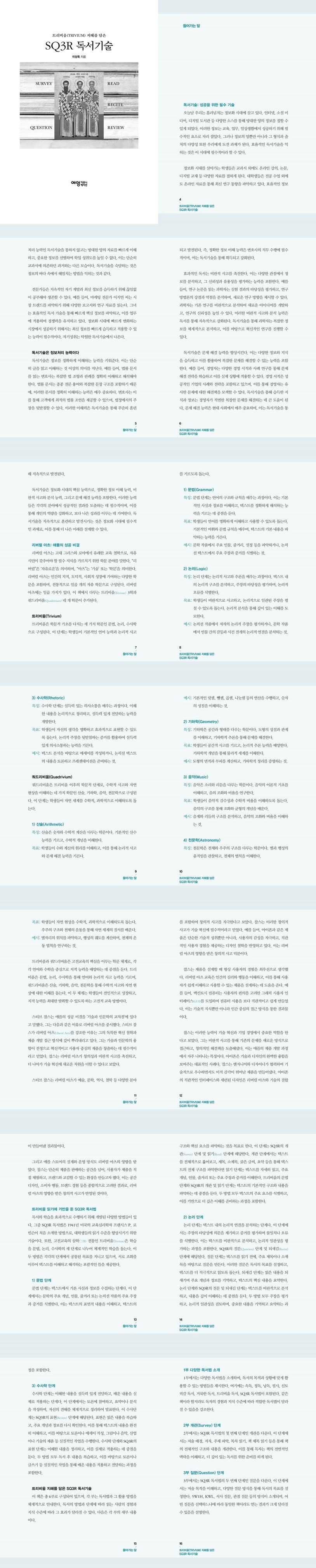Survey(개관), Question(질문), Read(읽기), Recite(되새김), Review(표현)를 의미하는 SQ3R 방법은 이해력과 기억력을 모두 향상하는 읽기 및 학습에 대한 체계적인 접근 방식을 제공한다. 이 방법은 단순한 텍스트 훑어보기나 피상적인 참여를 뛰어넘는다. 독자가 콘텐츠에 적극적으로 참여할 수 있도록 하여 주제에 대한 더 깊은 이해를 촉진한다. SQ3R 독서법을 구현함으로써 독자는 텍스트에 접근하는 방식을 변화시켜 독서 과정을 더욱 목적 있고 체계적이며 궁극적으로 더 보람 있게 만들 수 있다.