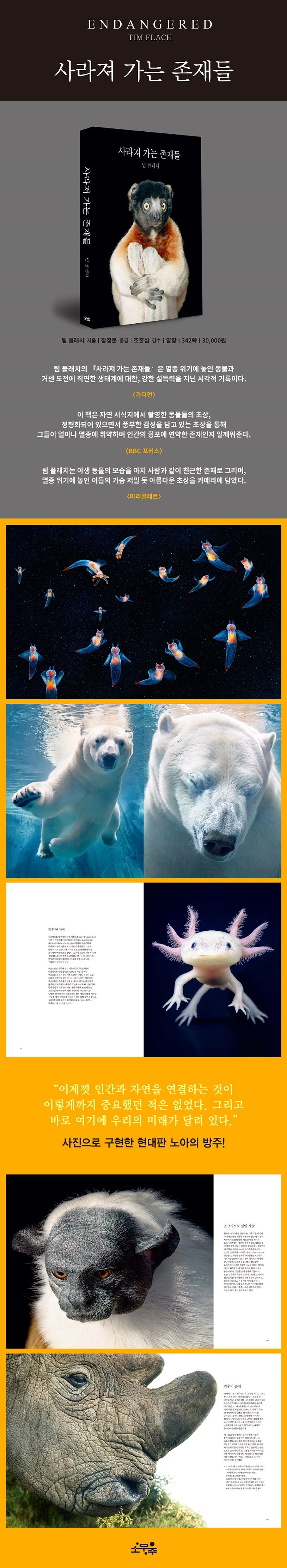 생물종이 멸종하는 이유는 기후 변화, 서식지 감소, 환경 오염, 질병 등 다양하지만, 오늘날 빠른 속도로 이들이 멸종하고 있는 데에는 인간의 책임이 크다. 사람들은 동물을 마구 잡고 무분별한 개발로 서식지를 파괴했으며, 오염물질을 배출해 지구 온난화를 초래함으로써 이들이 살아가는 지구의 환경을 변화시켰다. 『사라져 가는 존재들』은 사진작가 팀 플래치가 멸종 위기에 처한 생물종의 모습을 담은 사진과 간결한 설명을 통해 이들이 어떤 위협에 처해 있는지 알려준다. 그는 동물들의 심오하고, 처연하고, 기이하고, 심금을 울리는 초상을 통해 이들의 “인간적인” 면을 부각해 독자의 교감을 끌어내고 관심을 유도한다.