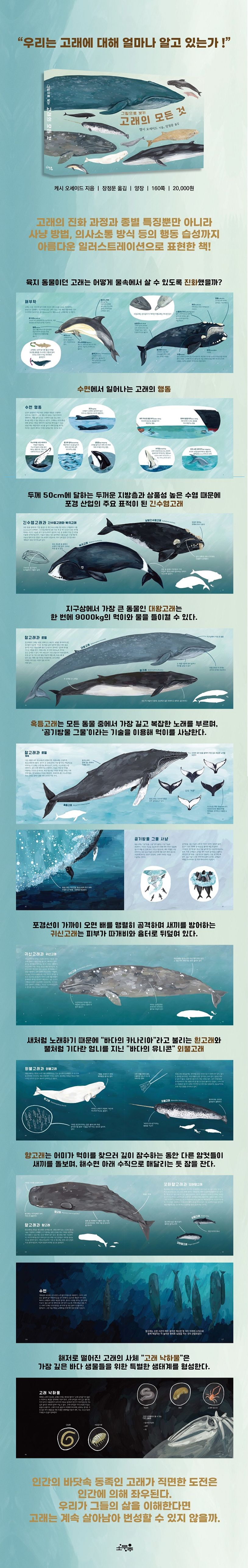 『그림으로 보는 고래의 모든 것』은 육지 동물이던 고래의 진화 과정은 물론, 복잡하게 여겨질 수 있는 고래의 분류 체계를 각 종의 특징을 포착한 그림을 통해 간결하게 나타낸다. 또한 고래가 먹이를 먹는 방식과 사냥 방법, 짝짓기와 의사소통, 수면 방식 등 고래의 삶과, ‘고래 낙하물’이 만드는 새로운 해저 생태계 등 흥미롭지만 잘 알려지지 않은 사실도 알려준다. 고대 신화에도 등장하던 고래가 인간의 무분별한 사냥으로 어떤 결과를 맞게 되었는지, 그리고 오늘날 인간과 고래의 관계는 어떻게 변하고 있는지 새롭게 알 수 있는 기회가 될 것이다.