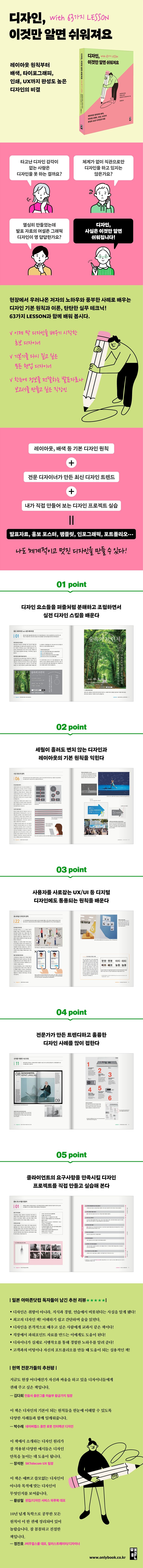 초보와 현업 디자이너는 물론, 기획자, 마케터, 발표자, 직장인 등 ‘디자인’을 통해 정보를 전달해야 하는 이라면 모두가 알아야 할 기초 디자인 지식과 실무 테크닉이 가득하며, 실무에서 활용 가능한 “레이아웃 디자인의 기본 원칙부터 배색, 타이포그래피, 패키지, 포스터, 인쇄물, 인포그래픽”에 이르기까지 63가지 LESSON으로 세분화된 풍부한 디자인 사례와 제작 기법 등이 잘 정리돼 있다.