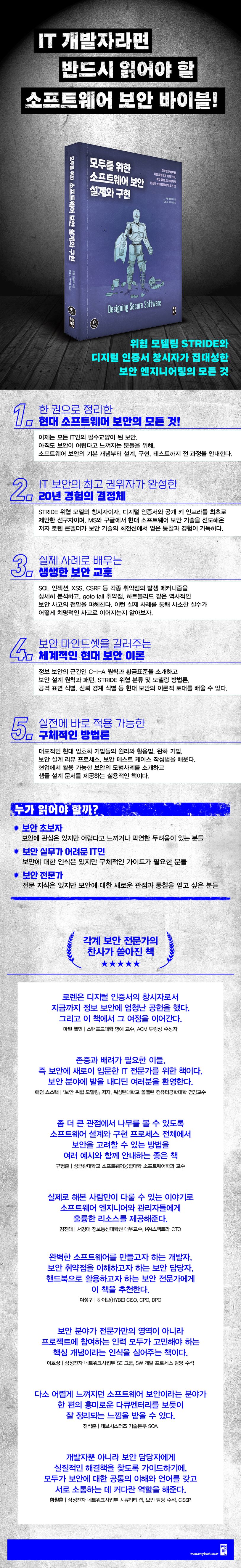 핵심 보안 개념인 신뢰, 위협, 완화, 보안 설계 패턴, 암호화를 설명하며 1부를 시작한다. 2부에서는 보안을 염두에 두고 소프트웨어를 설계하고 검토하는 과정을 다룬다. 마지막 3부에서는 C와 파이썬으로 작성된 다양한 코드 예제를 활용해 취약점이 만들어지는 코딩 결함에 대해 자세하게 살펴본다.
