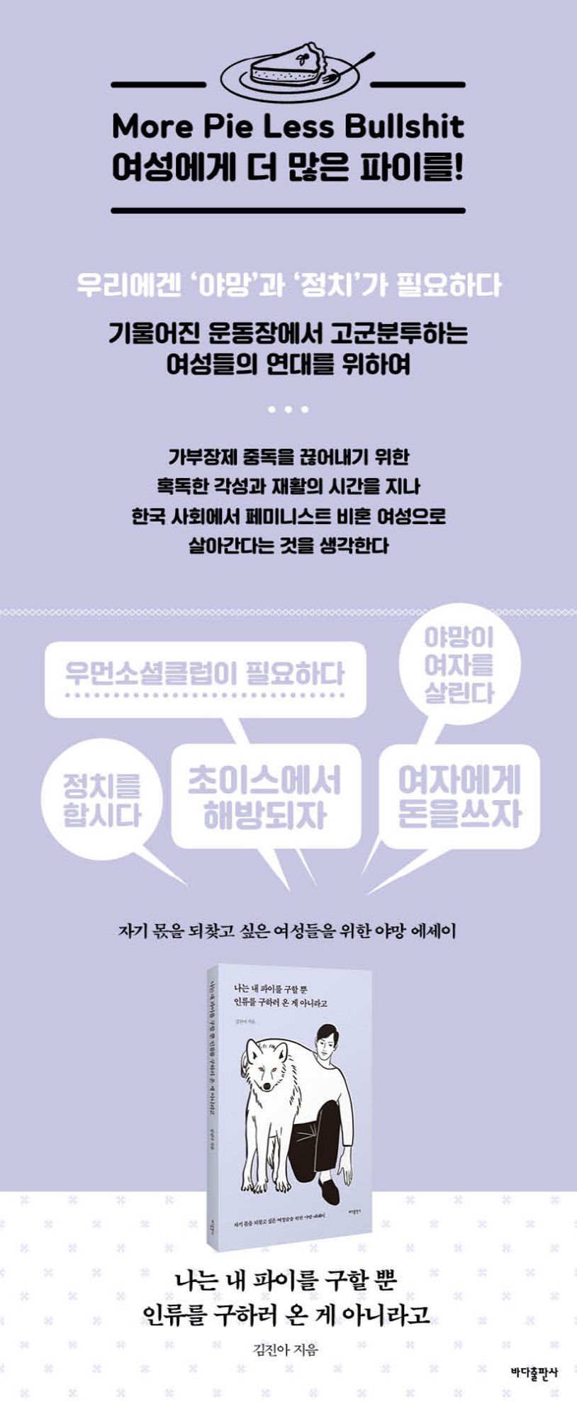 “여자라고 더 착하거나 도덕적인 존재일까? 아니다. 혹시 그렇게 느껴진다면 그건 여성이 사회적, 육체적 약자로서 권력에 더 잘 순응했기 때문이다. 여자도 얼마든지 부도덕해질 수 있다. 남자만큼 혹은 남자보다 잔인해질 수 있다. 무엇보다 페미니즘은 평화주의가 아니며 도덕성 투쟁이 아니다. 남자들에게 빼앗긴 여자 몫의 파이를 되찾는 투쟁이다. 한마디로 밥그릇 싸움이다. 먼저 이것에 대한 합의가 있어야 한다. 내 기분 좋자고, 힐링하려고, 더 멋진 나로 꾸미려고, 더 나은 남자를 찾으려고 하는 게 페미니즘이 아니라는 사실. 자기계발이 아닌 정치의 영역이라는 사실. 페미니즘이 남성 중심 사회와 가부장제를 향한 생존 투쟁이자 해방운동이라는 기본적 합의가 이루어지면 여자들은 많은 것들로부터 자유로워진다. 나는 내 파이를 구할 뿐 인류를 구하러 온 게 아니라고!”―‘나는 내 파이를 구할 뿐 인류를 구하러 온 게 아니라고’에서(33-34쪽)