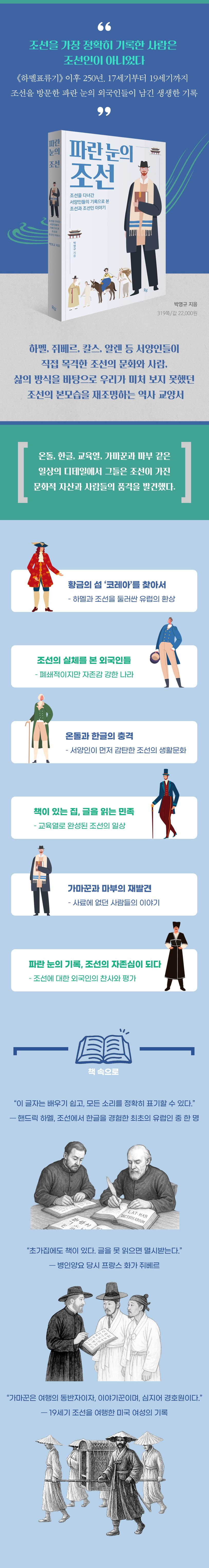 《파란 눈의 조선》은 네덜란드인 하멜에서 프랑스, 영국, 미국, 러시아에서 온 신부, 화가, 의사에 이르기까지, 당시 조선을 방문했던 서양인들의 생생한 기록을 바탕으로 조선의 또 다른 모습을 발굴한 역사 교양서다.