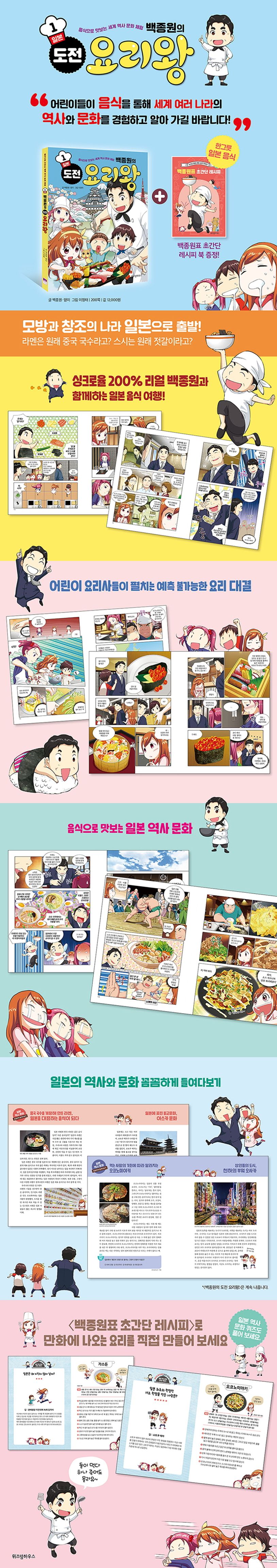 제1권 《일본》은 모방과 창조의 나라 일본으로 떠나 일본을 대표하는 음식을 직접 맛보고 만드는 과정을 통해 일본의 역사와 문화를 살펴봅니다. ‘백종원의 도전 요리왕’ 1차 대결을 통과한 나래, 보담, 세찬이는 백종원 대표와 함께 일본으로 갑니다. 현지 식당에서 라멘, 돈부리, 스시, 오코노미야키 등 일본의 역사와 문화가 담긴 음식을 맛보고 주어진 미션에 따라 요리 대결을 펼치는데……. 먹는 걸 좋아하는 나래, 요리에 대한 지식이 풍부한 보담이, 고기 요리에 강한 세찬이. 누가 일본 요리왕이 될까요?