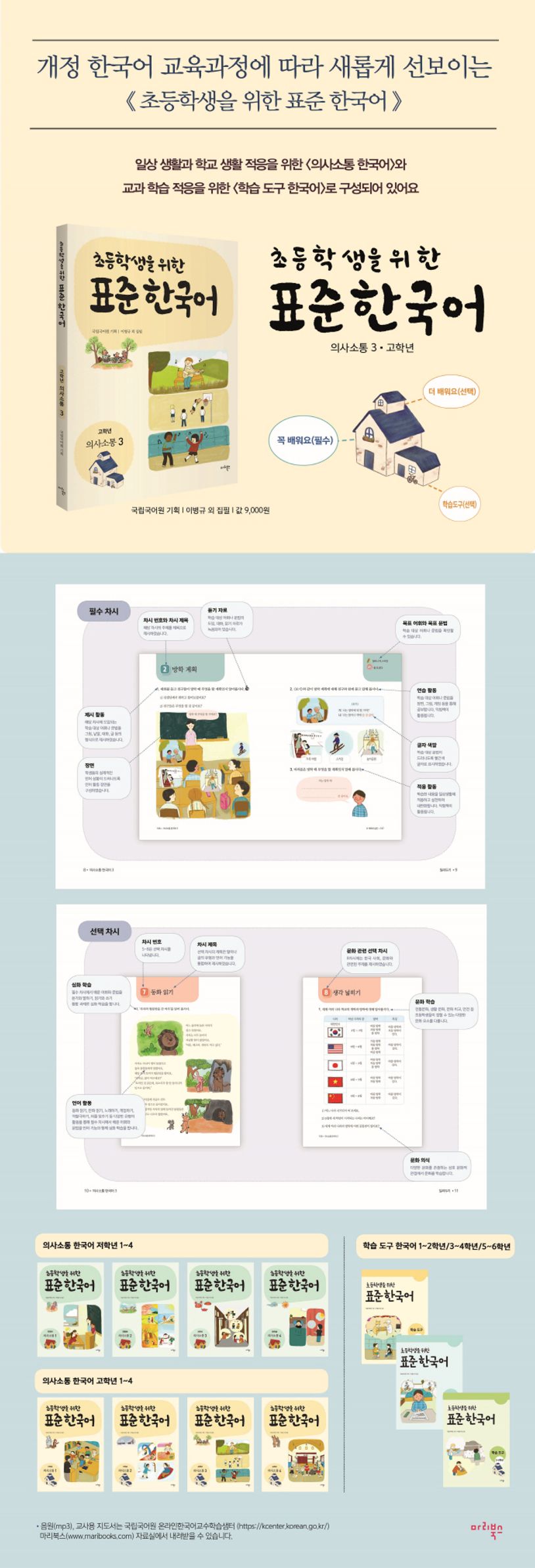 이번에 출간된 《초등학생을 위한 표준 한국어》 교재는 2017년 한국어 교육과정 개정 고시에 따라 개발된 것입니다. 이 교재는 한국어 능력이 없거나 현저히 부족한 학생이 대상이며, 다양한 수준의 학습자를 고려하여 교재를 선택할 수 있는 ‘모듈화’ 방식을 채택했습니다. 특히 이번 교재는 <의사소통 한국어>와 <학습 도구 한국어>로 나눈 것이 특징입니다. <의사소통 한국어>는 일상생활에 필요한 한국어 의사소통 능력을 기르기 위한 교재입니다. <학습 도구 한국어>는 한국 교과 과정을 잘 따라갈 수 있도록 도와주는 교과 한국어 어휘 등을 배우는 교재입니다.