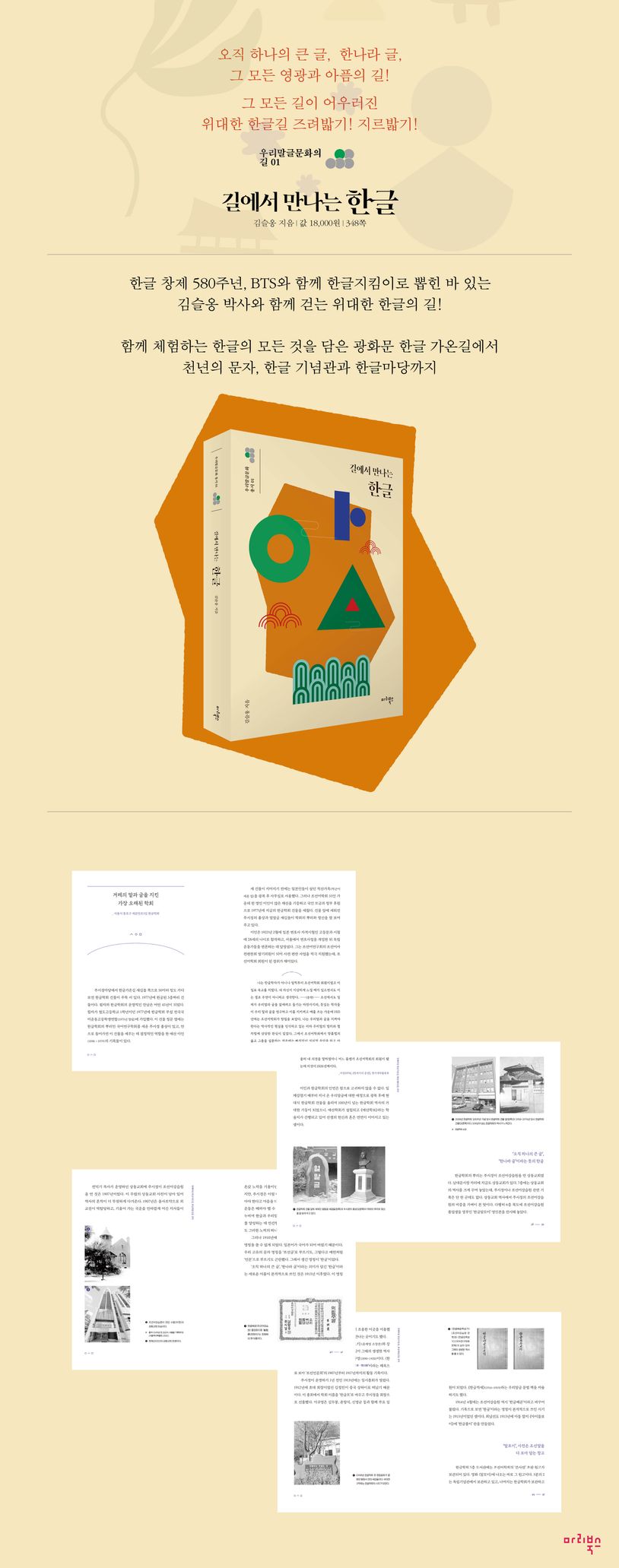 우리말글문화의 길, 그 첫 번째인 이 책은 지난 45년간 한글학자이자 한글운동가, BTS와 함께 한글지킴이로도 뽑힌 바 있는 김슬옹 박사의 한글 문화유산 즈려밟기이다. 한글의 탄생에서 지금까지, 김슬옹 박사의 한글 길 찾기는 지금도 계속되고 있다. 이 책은 그 길의 증언록으로 1443년 한글 창제 이후 천년의 세월 동안, 이 땅의 곳곳에 남아 있는 한글의 흔적을 찾아 기록했다. 《훈민정음》 해례본 서문에 실린 세종의 바람대로 한글이 세계의 중심으로 우뚝 서기를 꿈꾸는 저자와 함께 위대한 한글의 길을 걸어보자! 그야말로 한글의 역사가 한눈에 펼져질 것이다.