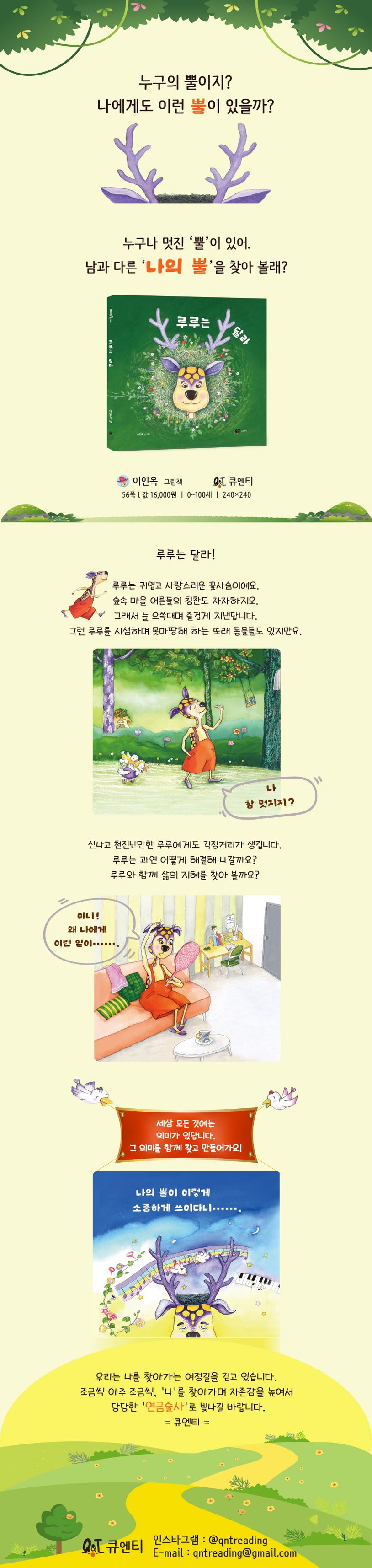 이 작품은 꽃사슴 루루가 남과 다른 모습으로 마음 아파하다가, 오히려 남과 다른 모습 덕분에 자신을 찾게 되어 당당하고 자존감 높은 루루로 성장합니다. 각자 다른 재능과 모습을 타고났음에도 언제나 비교당하며 마음 아파하는 어린이는 물론, 어른들까지도 루루에게 공감하며 조금이나마 마음이 치유되기를…….