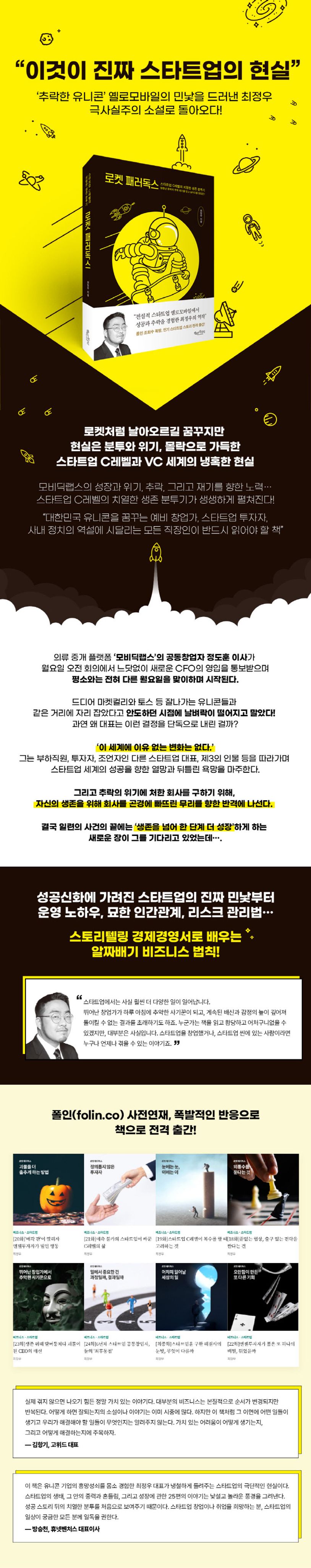 화제작 『스타트업은 어떻게 유니콘이 되는가』의 저자 최정우가 2년 만에 신작 『로켓 패러독스(Rocket Paradox)』를 선보인다. 이 작품은 스타트업 C레벨의 치열한 생존 분투기를 생생하게 그려낸 스토리텔링 경제경영서다. 작품 배경인 모비딕랩스는 설립된 지 5년 된, 연 매출 84억 원 규모의 스타트업이다. 경영 위치, 자금난, 음모와 배신 등 사건 사고가 끊이지 않아 회사가 롤러코스터에 올라탄 듯 요동친다. 공동창업자 중 한 사람이자 COO와 CFO를 겸하고 있는 정도훈 이사의 눈을 통해 우리는 대한민국 스타트업의 실상을 살피는 동시에, 사회생활의 생존력을 한층 업그레이드할 수 있는 인사이트와 알짜배기 비즈니스 법칙을 얻을 수 있다.
