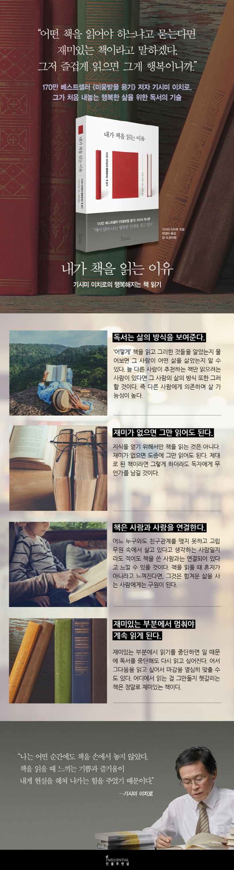 ‘행복한 삶’에 대한 안내자, 170만 독자를 사로잡은 《미움받을 용기》의 저자 기시미 이치로가 이번에는 ‘행복한 독서법’을 가지고 우리 곁에 돌아왔다. 《내가 책을 읽는 이유》는 유년 시절부터 이어져온 그의 농밀한 독서 체험을 바탕으로 하는 첫 독서 에세이로, ‘책과 인생’을 대하는 그의 남다른 지론이 담겨 있다.