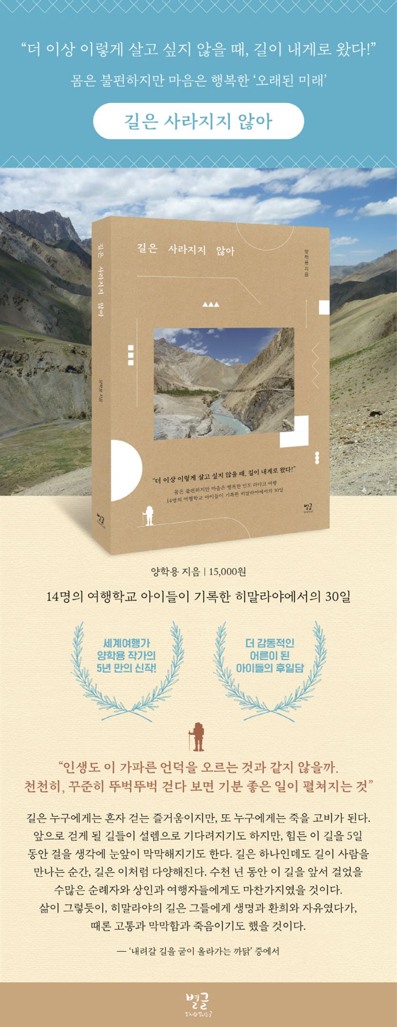 ‘여행학교’라는 이름으로 14명의 청소년들과 함께한 여행 이야기 『길은 사라지지 않아』를 우리나라를 대표하는 세계여행가이자 베스트셀러 작가, 초등교사인 양학용이 신작으로 내놓는다. 작가가 선보이는 5년 만의 신작이다. 여행학교 일행이 한 달여 동안 함께 다녀온 곳은 라다크의 여러 마을들과 북인도의 몇몇 도시들, 그리고 히말라야다. 라다크는 세계적인 생태환경 운동가인 헬레나 노르베르 호지가 출간한 베스트셀러 『오래된 미래』의 무대다. 그야말로 ‘오래된 것’과 ‘미래’의 가치가 공존하는 곳이다. 아이들은 라다크의 전통 마을들을 여행하며 느림과 부족함의 가치에 대해 생각하고, 해발 5천 미터를 넘나드는 히말라야 트레킹을 하며 자신의 소중함을 발견하고, 북인도의 오래된 골목길을 걸으며 문화가 가진 다양성의 힘에 대해 배우고 즐겼다. 그리고 무엇보다 ‘나’를 찾고, ‘인생의 길’을 찾았다. 이 과정은 양학용 작가의 뛰어난 글솜씨와 아이들이 매일같이 성실하게 적어 내려간 생생하고 솔직 발랄한 일기들에 빼곡히 담겼다. 『길은 사라지지 않아』는 청소년에게는 즐거움을 안겨주는 또래의 여행 일기, 부모에게는 좋은 자녀 교육서로, 교사에게는 새로운 교육 방향을 모색하는 지도서가 되어줄 것이다.