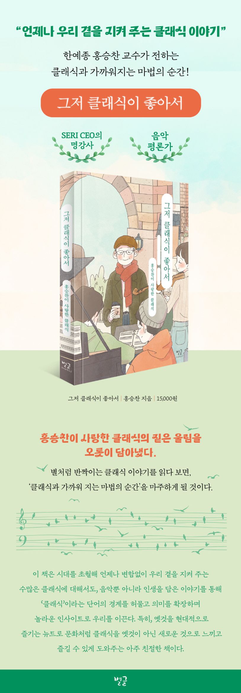 별글 ‘그저 좋아서 시리즈’의 두 번째 책으로 선보이는 《그저 클래식이 좋아서》. 이번 책에는 국내 예술경영 1세대 교육자, 한국예술종합학교 교수, SERI CEO의 명강사, 또 음악평론가로도 활발히 활동 중인 저자 홍승찬이 사랑한 클래식의 짙은 울림을 오롯이 담아냈다. 엔니오 모리꼬네, 조스캥 데 프레, 레너드 번스타인, 헤르베르트 폰 카라얀, 안드레아스 세고비아, 프레디 머큐리, 클라라 슈만 등 그가 몇 년 동안 월간 〈객석〉과 〈채널예스〉에 연재했던 음악 칼럼 가운데 서른일곱 편을 소개한다. 전작 《클래식이 필요한 순간들》, 《그땐 미처 몰랐던 클래식의 즐거움》 등에서 못다 한 ‘별처럼 반짝이는 클래식 이야기’를 읽다 보면, 클래식과 가까워지는 마법의 순간을 마주하게 될 것이다.