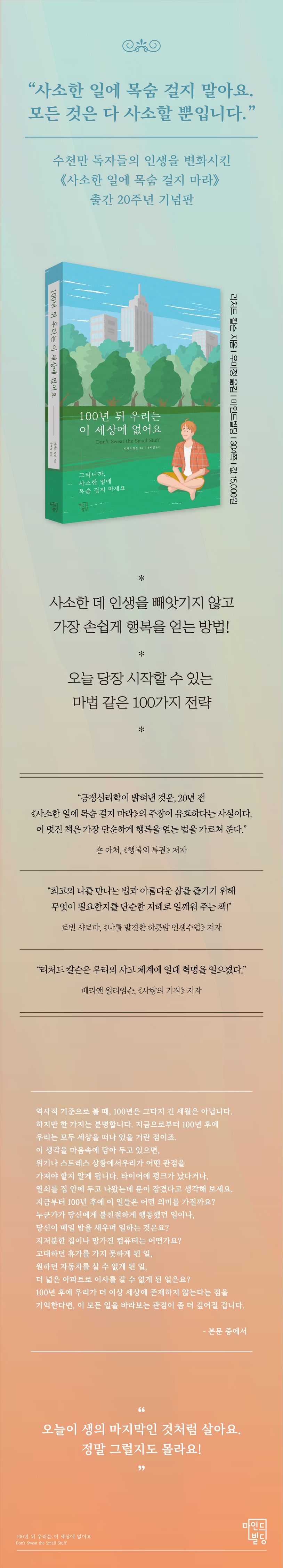 20세기 말에 출간되어 전 세계 3,000만 부가 판매됐고, 101주간 〈뉴욕타임스〉 베스트셀러에 올랐던 《Don’t Sweat the Small Stuff(사소한 것에 목숨 걸지 마라)》의 출간 20주년 기념판을 현대적인 감각에 맞게 《100년 뒤 우리는 이 세상에 없어요》로 다시 펴냈다. 45세의 짧은 나이로 세상을 떠났던 저자 리처드 칼슨의 메시지가 2020년, 그것도 전대미문의 판데믹 세상을 살아가는 우리에게 진정 어떤 의미로 다가올 수 있을까. 궁극적으로 내면의 평온을 이뤄 ‘자기 자신과 잘 지내는 법’을 말하는 ‘자기관계론’이라고 명명할 수 있을 것이다. 정말 중요한 것에 집중하기 위해, 미리 중요한 것으로 정해 놓은 것 외에는 사소한 것(small stuff)으로 정해 놓은 다음, 거기 너무 애쓰고, 마음 쓰고, 땀 흘리지 말라(don’t sweat)는 철학이 100가지 메시지에 빼곡히 담겨 있다.