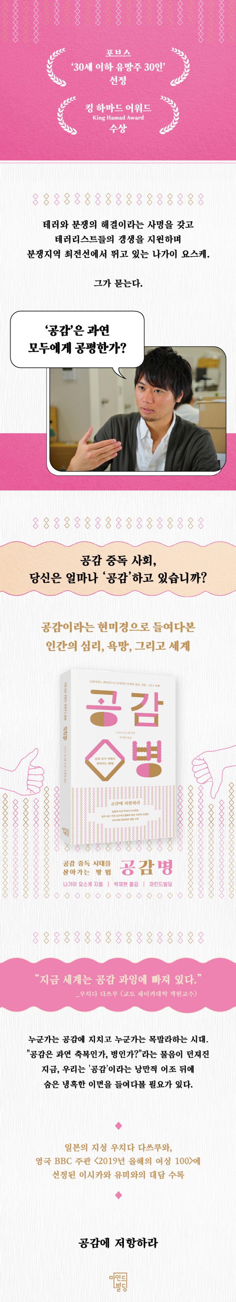 《공감병》은 ‘공감’이라는 낭만적 어조 뒤에 숨은 공감의 진위를 파헤치겠다는 사명을 품은 책이다. 저자인 나가이 요스케는 소말리아 등의 분쟁 현장에서 테러 단체의 투항병이나 체포자, 폭력단의 과격화 방지를 실시할 뿐만 아니라 테러 단체와 꾸준한 교섭을 시도하며 테러와 분쟁 해결이라는 궁극적인 목표에 다가가기 위해 노력하고 있다. 그는 자신이 직접 만난 사람들, 겪은 일들을 토대로 ‘공감’ 안에 내포된 차별과 혐오에 대해 고민한 결과로 자기만의 ‘공감론’을 설립했다. 이 책에서 저자는 대면했던 테러리스트들의 사례가 담긴 생생한 현장 이야기, ‘#KuToo’ 운동으로 BBC ‘세계의 영향력 있는 100인의 여성’에 선정된 이시카와 유미와 일본의 지성 우치다 다쓰루와의 대담 등을 수록해 공감의 냉혹한 이면을 명명백백 밝히고자 하였다.