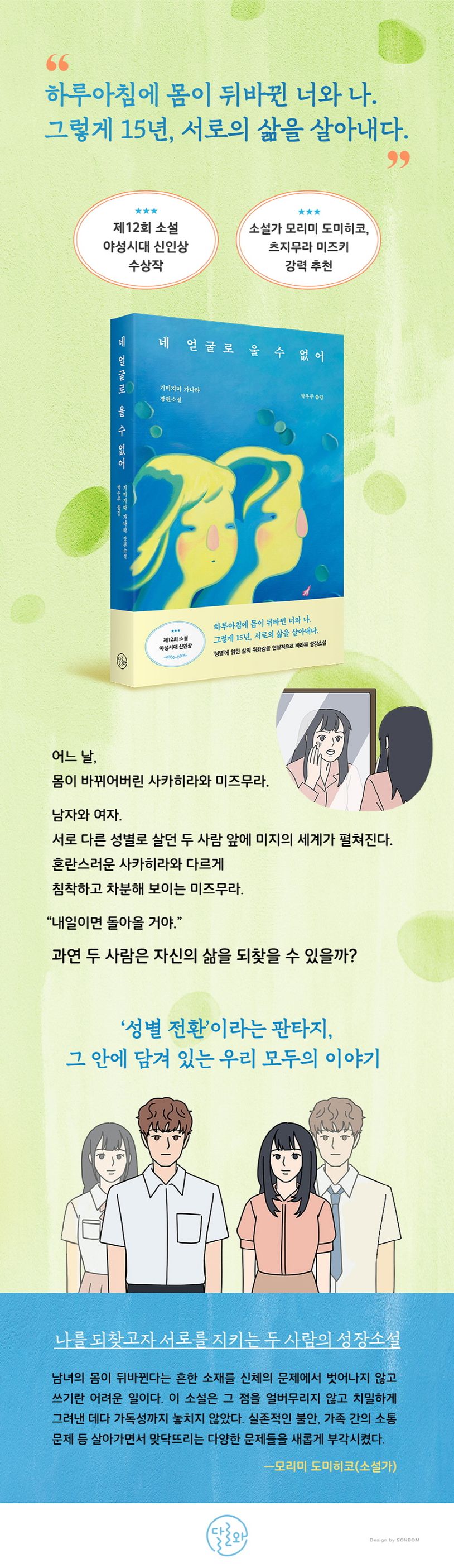 「제12회 소설 야성시대 신인상」을 수상한 기미지마 가나타의 장편소설 『네 얼굴로 울 수 없어』는 고등학교 시절 몸이 바뀌어버린 사카히라와 미즈무라의 관계를 남녀 간의 연애 감정으로 풀어내지 않고, 함께 살아낼 동료의 감정으로 풀어냈다는 점에서 소설가 모리미 도미히코, 츠지무라 미즈키의 극찬을 받았다.