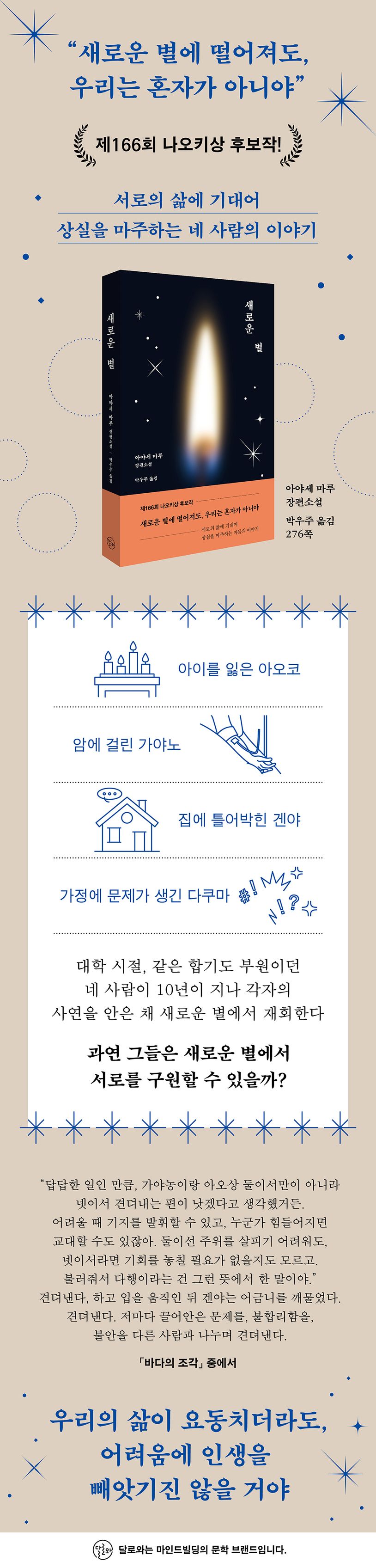 『새로운별』은제166회나오키상후보작으로,제158회나오키상후보작,제5회고교생나오키상수상작인『치자나무』의작가아야세마루의작품이다.아야세마루는스며드는듯잔잔하고도섬세한필치를선보이며,일본문단을이끌차세대작가로주목받고있다.