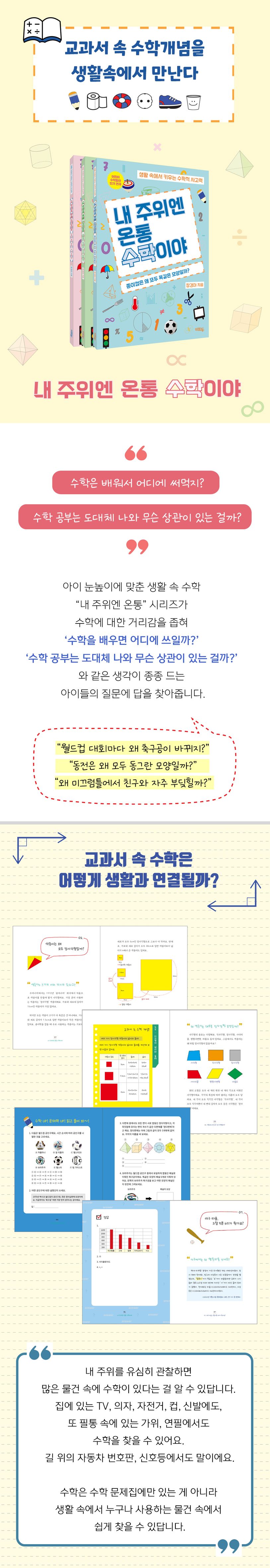 내 주위를 유심히 관찰하면 많은 물건 속에 수학이 있다는 걸 알 수 있답니다. 집에 있는 TV, 의자, 자전거, 컵, 신발에도, 또 필통 속에 있는 가위, 연필에서도 수학을 찾을 수 있어요. 길 위의 자동차 번호판, 신호등에서도 말이에요. 수학은 수학 문제집에만 있는 게 아니라 생활 속에서 누구나 사용하는 물건 속에서 쉽게 찾을 수 있답니다.
