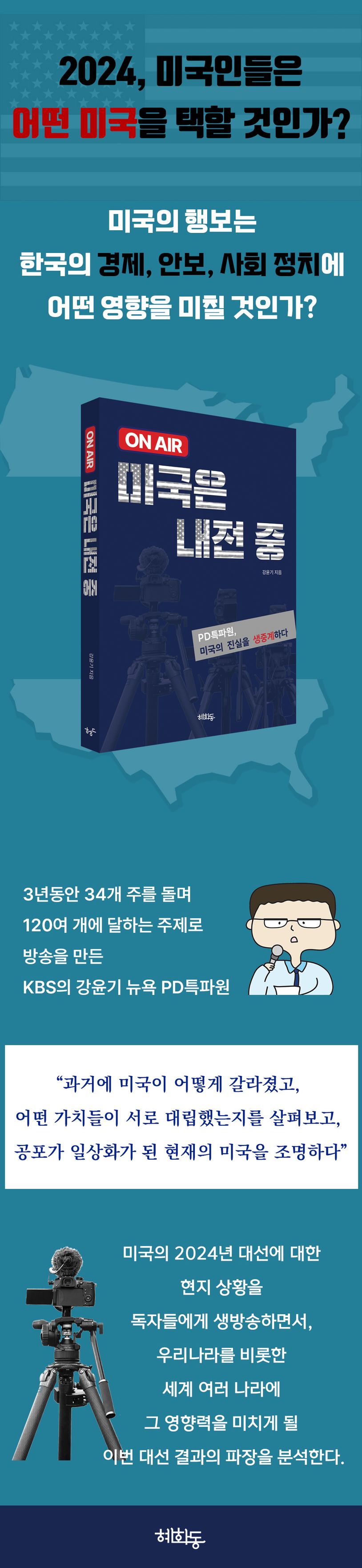 3년간 KBS PD특파원으로 있으면서 미국 사회의 속살을 날카롭게 파고들었던 강윤기 PD가 지금 미국의 분열은 어디서 시작했고, 갈등의 뿌리는 무엇이었는지, 그리고 2024년 미국 대통령 선거가 이 나라에 만연한 분열에 어떤 의미가 있는지 보여주며 앞으로 미국은 어디로 향할지 예측한다. 또한 트럼프와 헤리스의 집권 시나리오에 따라 달라지는 미국이 우리나라를 비롯한 세계 여러 나라에 어떻게 그 영향력을 미치게 될 이번 대선 결과의 파장을 분석한다.