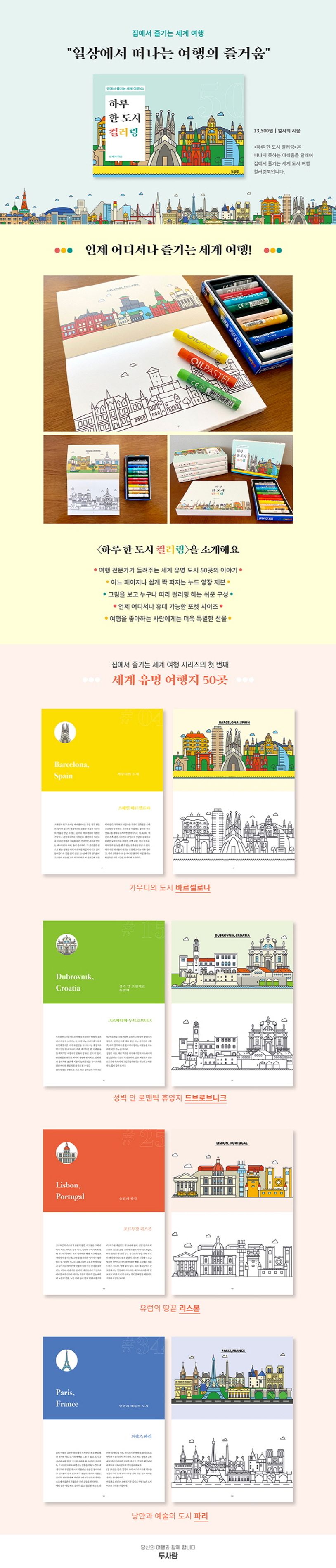 《하루 한 도시 컬러링》은 여행하지 못하는 아쉬움을 달래며 집에서 즐기는 세계 도시 여행 컬러링북이다. 여행 전문가가 전하는 세계 50개 도시에 대한 이야기를 읽고, 그 도시의 대표 이미지에 자기만의 컬러링을 입혀보자. 순식간에 일상에서 여행지로 떠나게 되는 마법 같은 시간이 펼쳐질 것이다.