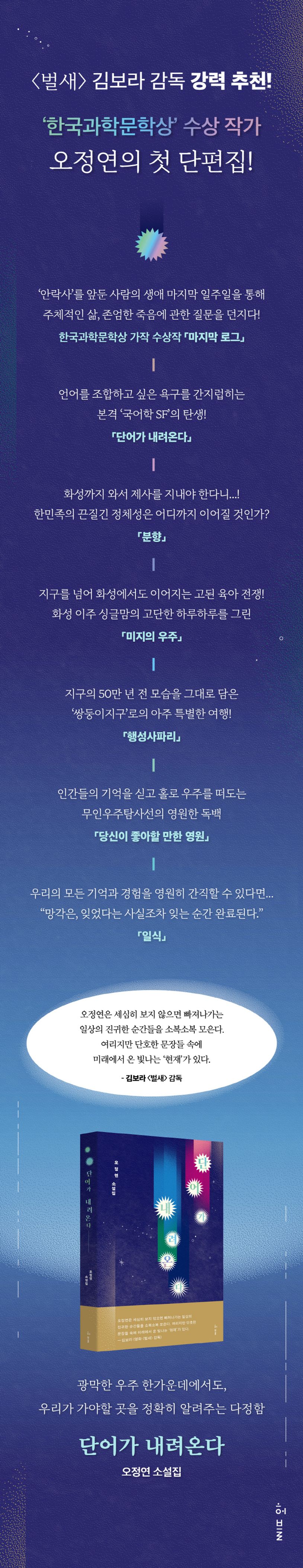 이곳저곳을 유랑하며 다양한 삶의 궤적을 그려온 작가의 여정을 방증하듯 『단어가 내려온다』에는 ‘이주자’, ‘이방인’의 회한과 그리움, 그러면서도 어디서든 자신의 뿌리를 잃지 않으려는 단단한 마음이 깃들어 있다. 수록작 「분향」은 지구를 떠나온 화성 이주자들이, 화성에서조차 지구의 명절을 챙기고 비대면으로 부모님 제사를 드려야 하는 웃지 못 할 현실을 묘파하고 있으며, 「미지의 우주」는 화성에서 딸 ‘우주’와 함께 싱글맘으로 당당하게 살아가는 주인공 미지의 고된 육아 분투기와 애환을 그리고 있다. 이처럼 오정연의 소설 속 인물들은 아무리 척박한 땅일지라도 끝내 뿌리내리는 강인한 식물처럼 어느 시간, 어느 장소에서건 자신의 삶을 꿋꿋이 이어간다.