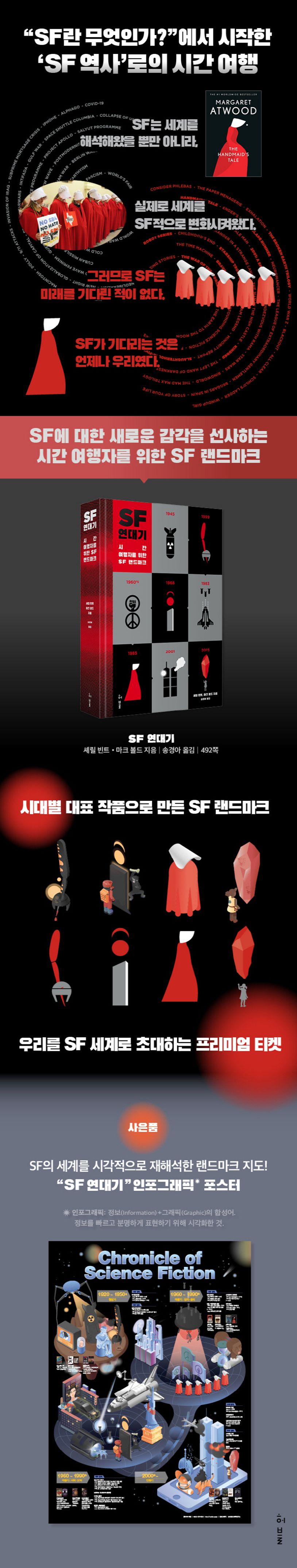 SF세계와현실세계는맞물리는톱니바퀴처럼서로에영향을미치며움직인다.두거대한세계의뒤섞임을상징하는역사적사건은크게네가지로나눌수있는데,첫번째는1939년부터1945년까지진행된“2차세계대전”,두번째는세계대전직후부터1991년소련해체까지진행된“냉전(우주경쟁)”,세번째는1960년대부터1980년대까지활발했던“인권운동”,네번째는냉전종식이후20세기에들어서면서발생한“9·11테러”다.그리고이러한역사적사건들에각각대응하는상징물로,세계대전을종식했을뿐만아니라인류절멸의시대를상상하게한최초의원자폭탄인“리틀보이”,세계대전직후이어진냉전시기에우주경쟁의변곡점을만들어냈을뿐더러신자유주의에서비롯한우파SF의영향력을고스란히보여줬던“스타워즈계획”,전쟁의폐허에서싹튼포스트모더니즘및카운터컬처,그리고이에영향받은소프트SF를양손에쥐고세상을뒤흔들었던“반전운동과페미니즘운동의기호”,인류의공포를전쟁에서테러로전환했을뿐만아니라다문화혐오의시발점이된“세계무역센터빌딩”을가져왔다.이러한역사적흐름에적절히부합하면서도우리에게시각적으로확실히각인한작품들을선별했는데,각각『스타십트루퍼스』,〈2001:스페이스오디세이〉,『시녀이야기』,〈부서진대지〉3부작이바로그것이다.그리고이를기준으로『SF연대기』표지를장식했다.