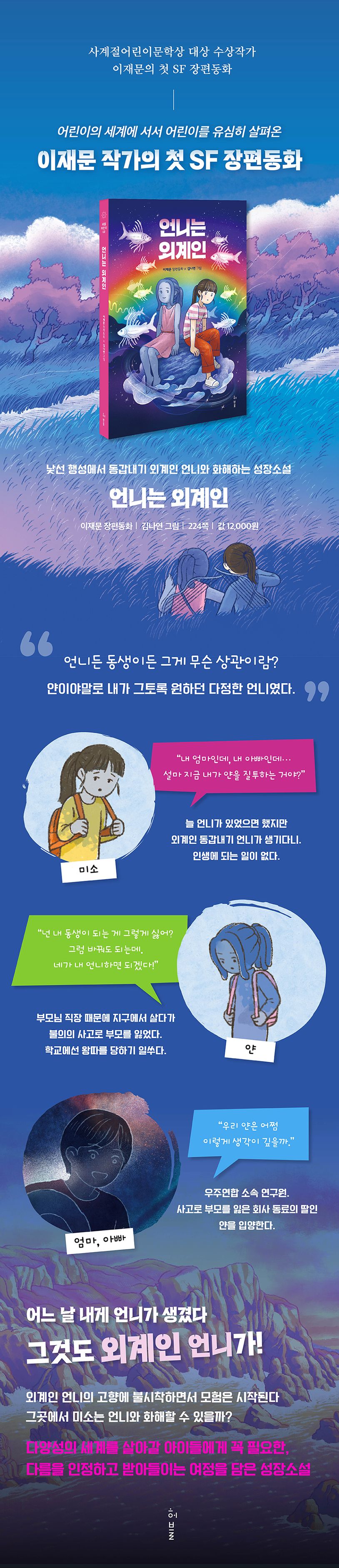 만일 열두 해 내내 평생 외동으로 살다가 갑자기 동갑내기 언니가 생긴다면 어떨까? 갑자기 동생이 태어나도 첫째들은 힘들어하는데 말이다. 게다가, 만약에 외계인 자매나 가족이 생긴다면 어떤 느낌일까? 과연 그들과 잘 지낼 수 있을까? 이 책에는 나와 전혀 다른 사람과 함께 세상을 살아가는 주인공 ‘미소’의 고민이 담겨 있다.