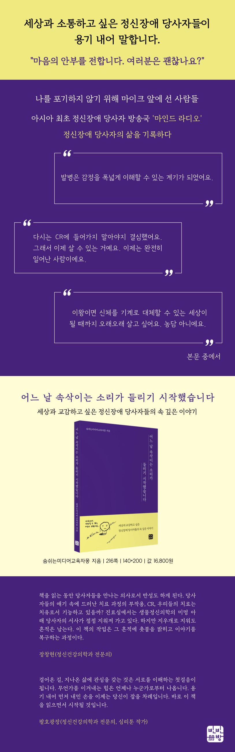 《어느 날 속삭이는 소리가 들리기 시작했습니다》는 정신장애 당사자들이 태어나 자라고 발병 후 살아온 삶을 풀어낸 책이다. 한 사람은 곧 하나의 세계라는 말이 있다. 정신장애 당사자라고 해서 다르지 않다. 이들의 삶에는 역사가 있고 서사가 있다. 정신장애 당사자들의 삶에 귀를 기울이는 일은 이들을 이해하는 첫걸음이 될 것이다. 이 책을 통해 정신장애 당사자들을 고립시키는 오해와 편견의 장벽이 얇아지기를 바란다.