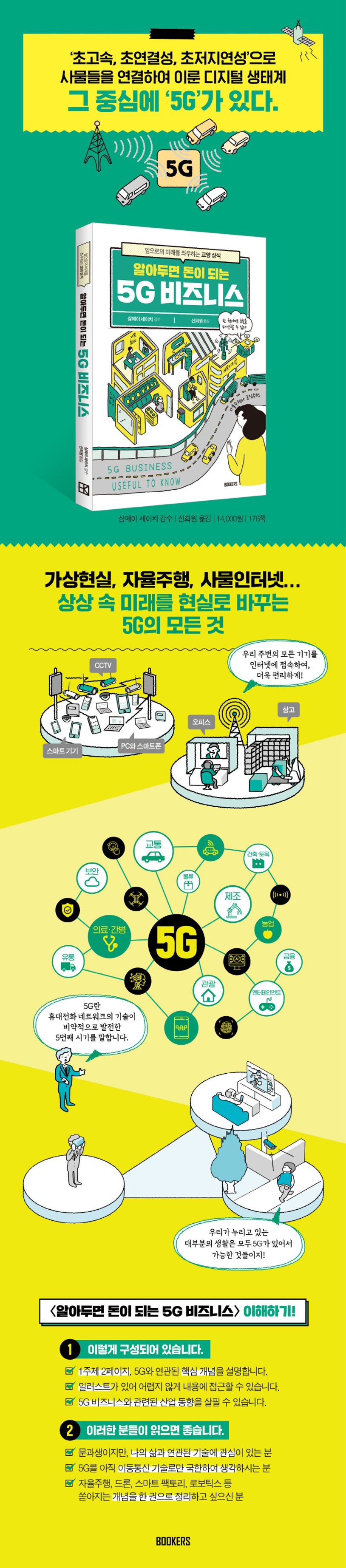가상현실, 자율주행, 사물인터넷 등 상상 속 미래가 현실이 되고 있는 그 중심에, 5G가 있다. ‘초고속’, ‘초연결’, ‘초저지연성’의 5G 특징이 교통, 물류, 의료, 보안, 농업, 유통, 금융, 관광 등의 주요 산업과 어떻게 연결되고, 어떤 비즈니스를 만들어내는지 키워드 중심으로 일러스트와 함께 소개한다.