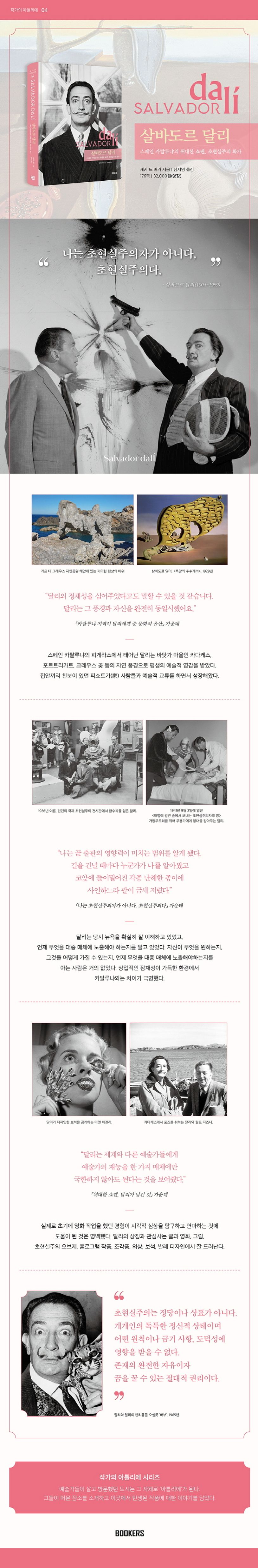 작가의 아틀리에 시리즈 네 번째. 초현실주의의 대표적인 화가 살바도르 달리가 살았던 장소와 그곳에서의 생활이 그의 삶과 예술에 어떤 영향을 끼쳤는지 알아본다. 〈기억의 지속〉, 〈메이 웨스트 입술 소파〉를 비롯한 유명한 작품은 물론, 그 당시 풍경, 그의 모습이 담긴 130장 이상의 도판이 실렸다. 이를 통해 그가 미술, 영화 공연 등 문화예술의 다방면으로 활동하며 ‘위대한 쇼맨’이 되는 과정을 흥미롭게 살펴볼 수 있다.