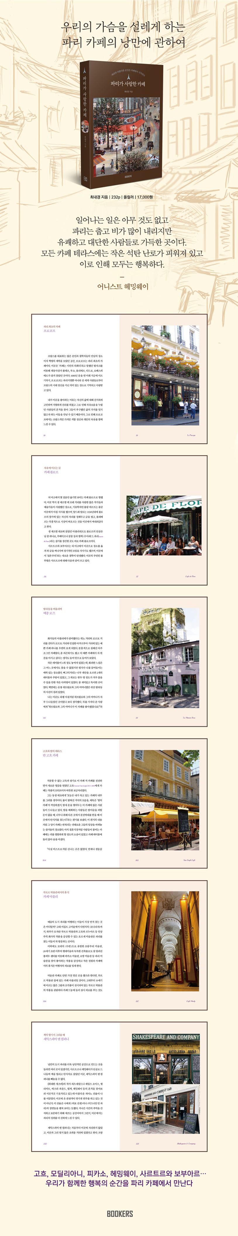 이 책은 파리 최초의 카페 프로코프, 카페 문학상을 처음 만든 되 마고, 사르트르와 보부아르의 아지트 카페 플로르, 바스티유 광장의 철학 카페 데 파르, 외로운 예술가들을 환대한 쿠폴과 셀렉트를 비롯해 에펠탑의 쥘 베른, 아르누보 감성의 막심과 책의 향기 가득한 셰익스피어 앤 컴퍼니까지, 파리 카페에 관한 다양하고 흥미로운 이야기를 담아냈다. 파리를 추억하는 이들에게는 한때의 행복했던 순간을 다시 마주할 수 있는 기쁨을, 언젠가 파리를 찾게 될 이들에게는 무엇과도 바꿀 수 없는 설렘을 선사할 것이다.