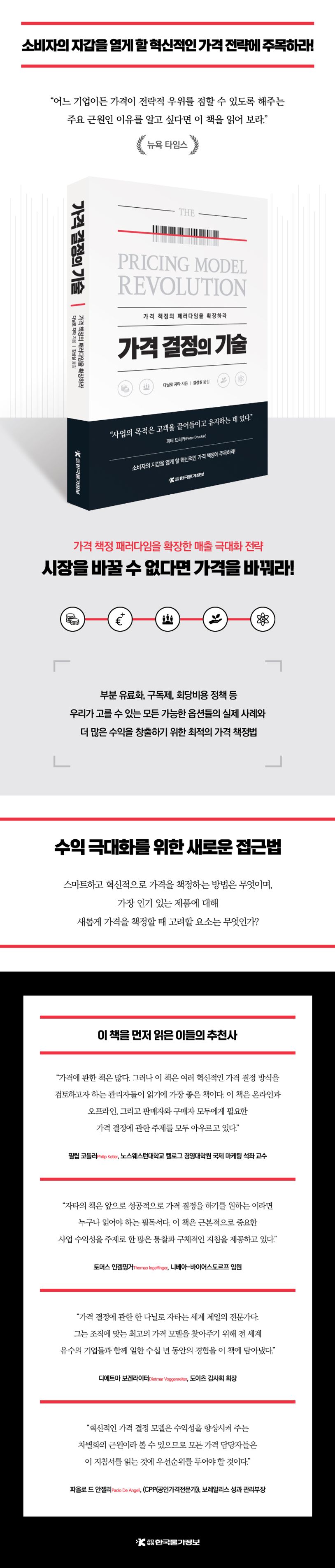 이 책은 기업의 매출을 성장시켜 경쟁 우위를 지속적으로 확보할 수 있는 혁신적인 가격 책정 전략에 관한 책이다. 가격 전략과 관련해 세계 최고의 전문가인 다닐로 조타는 이 책에서 경쟁 우위를 점하기 위한 필수적이고 매력적인 가격 책정 전략을 소개한다. 부분 유료화부터 구독제, 회당비용 책정 등 저자는 가격 책정에 있어서 우리가 고를 수 있는 모든 가능한 옵션을 구체적인 사례를 통해 보여주며, 더 많은 수익을 창출하기 위해 즉시 적용할 수 있는 구체적이고 실용적인 지침을 제공한다. 스마트하고 혁신적으로 가격을 책정하는 방법과, 모든 새로운 수익 창출 접근 방식을 구별하는 방법, 그리고 가장 인기 있는 제품에 대해 새롭게 가격을 책정할 때 고려해야 할 요소 등을 통해 여러분은 자신이 판매하는 제품과 서비스로 가장 적합한 수익을 창출하는 방법을 배우게 될 것이다.