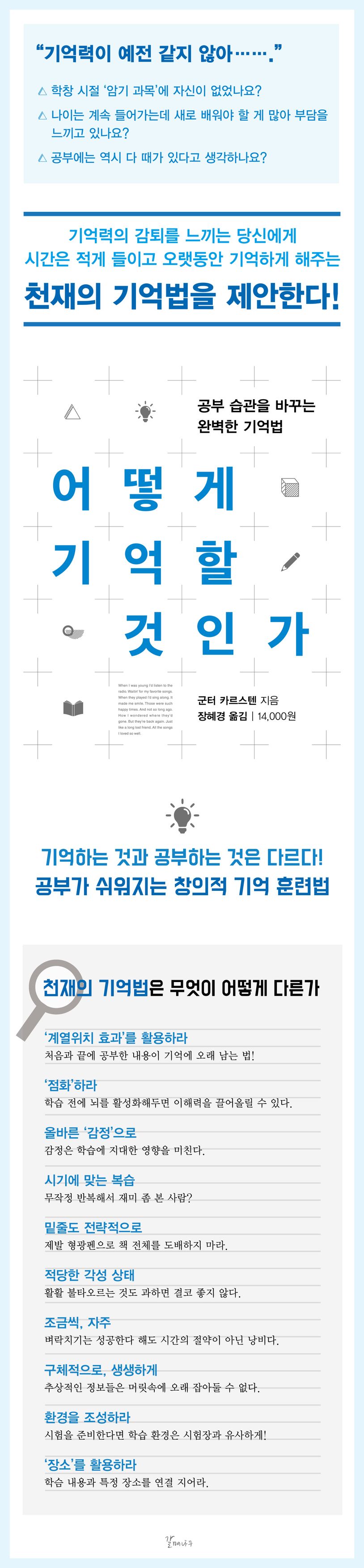 여키스-도슨 법칙(본문 37쪽), 자이가르니크 효과(본문 45쪽) 등 여러 연구 결과를 다루며 기억력 향상을 꾀하는 이들이 신경 써야 할 요소들을 설명하는 이 책에는, 저자가 직접 사용하여 드라마틱한 결과를 만들어낸 기억력 향상법이 담겨 있다. 저자는 우리가 모르고 있던, 혹은 알고 있었지만 제대로 운용하지는 못했던 공부법부터 신선하고 효율적인 암기법까지 두루 다룬다. 그뿐만 아니라 헷갈리는 정보들을 빨리 외울 수 있는 실용적인 팁, 독서의 기술, 함께 공부하고 기록하는 방법까지 학습 태도를 정비하는 데 도움이 될 내용도 다양하게 소개한다. 기억력 때문에 학습에 어려움을 겪어본 독자라면, 검색에 의존하는 두뇌를 스스로 기억하는 두뇌로 바꾸고 싶다면, 기존의 공부법을 해체하고 새롭게 효율적인 학습 체계를 쌓아가고 싶은 독자라면 《어떻게 기억할 것인가》에서 비법을 찾아보길 권한다.